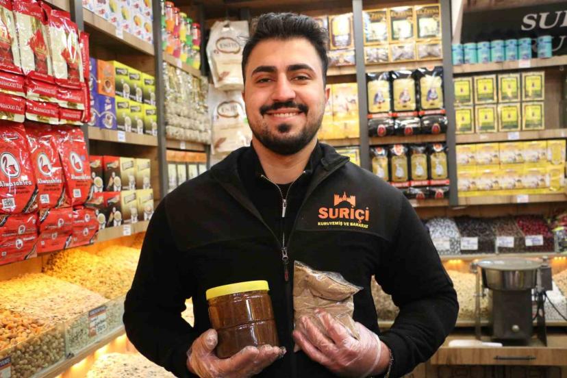 "Soğuk algınlığı, bronşit, nefes darlığı ve sigara içenler için çok faydalıdır. Birçok derde deva oluyor. Özellikle soğuk algınlığına ve nefes darlığı çekenlere iyi geliyor. Müşterilerim bunu kullandıktan sonra bana dua ediyor. İçerisinde 25 çeşit doğal bitki var. Karabaş otu, hatmi çiçeği, zencefil, tarçın ve buna benzer birçok bitkisel ürün bu karışımımızda bulunuyor."