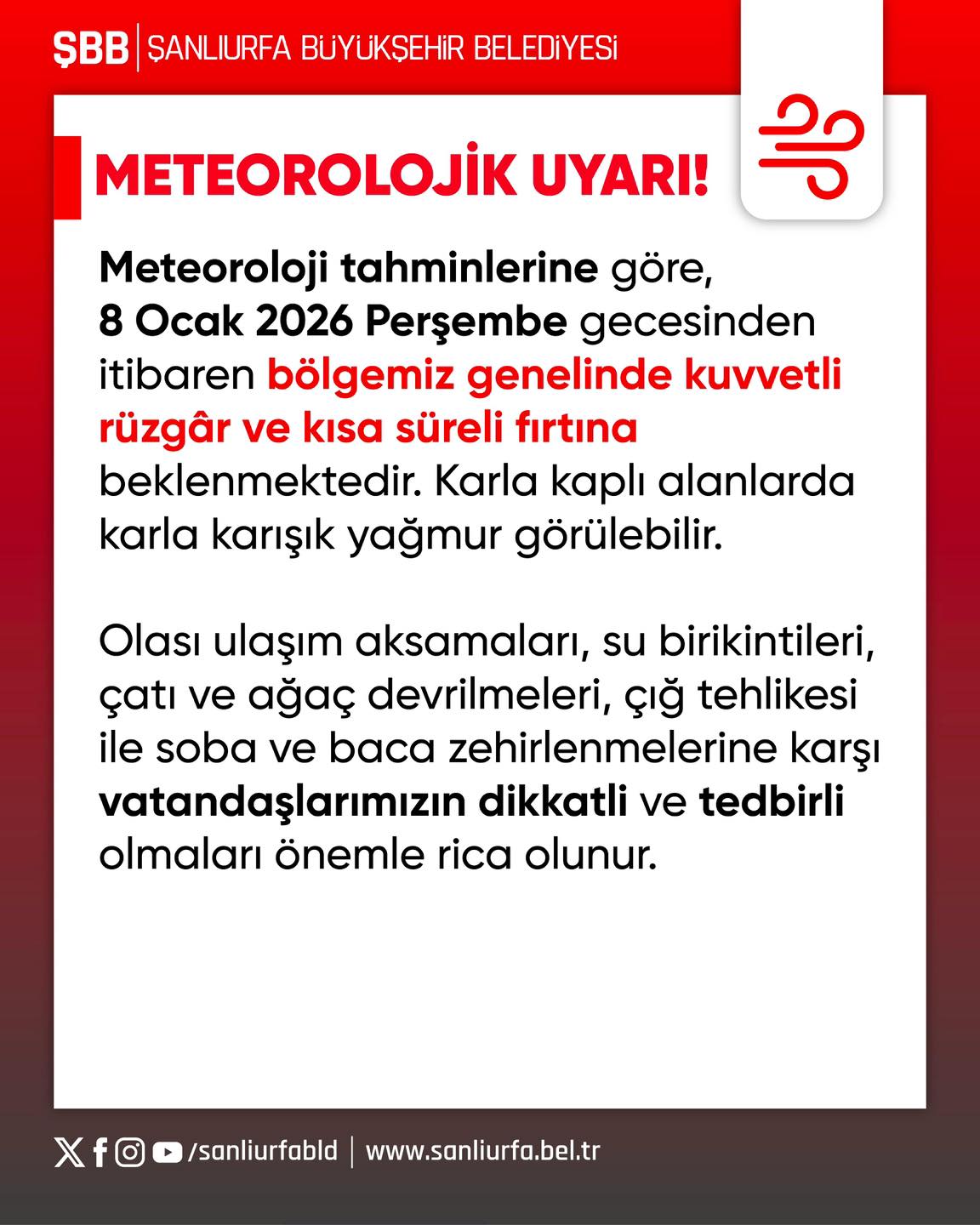Olası ulaşım aksamaları, su birikintileri, çatı ve ağaç devrilmeleri, çığ tehlikesi ile soba ve baca zehirlenmelerine karşı vatandaşlarımızın dikkatli ve tedbirli olmaları önemle rica olunur.”