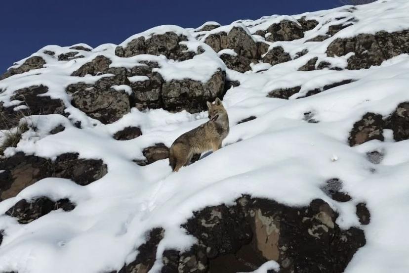Diyarbakır'ın Çermik ilçesinde karlı dağlık alanda yiyecek arayan kurt, dronla görüntülendi.