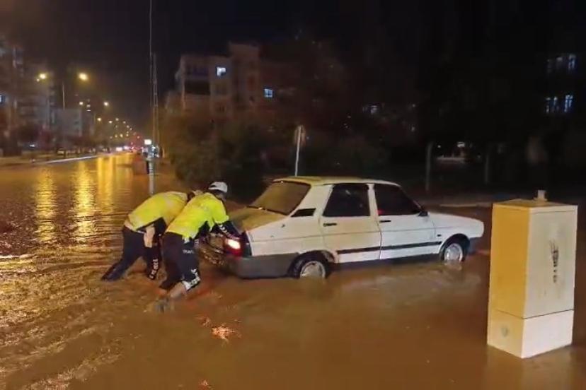 Meteoroloji Genel Müdürlüğü’nün sarı kod ile kuvvetli yağış uyarısı yaptığı illerin arasında yer alan Adıyaman’da yağışlar hayatı olumsuz etkiledi. Gök gürültüsü gecenin sessizliğini bozarken, çakan şimşekler geceyi aydınlattı. Etkili olan yağış nedeniyle cadde ve sokakları sel suları kapladı, araçlar mahsur kaldı. Trafik polisleri suyun içerisine girerek ittirdiği araçları kurtarmaya çalıştı.