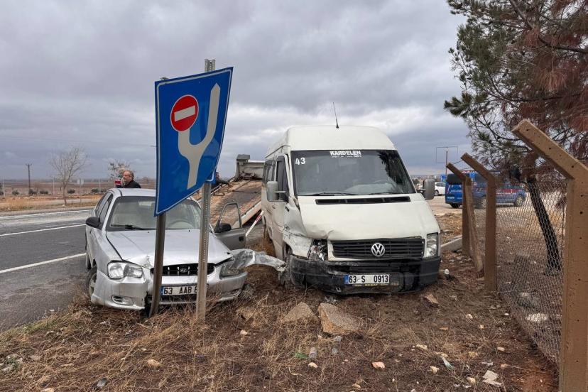 Ramazan B.’nin (40) kullandığı 63 S 0913 plakalı minibüs, Derviş Ş.’nin (68) kullandığı 63 AAB 672 plakalı otomobille çarpıştı. Çarpışmanın etkisiyle kontrolden çıkan her iki araç da yol kenarındaki trafik levhalarına çarparak durabildi.