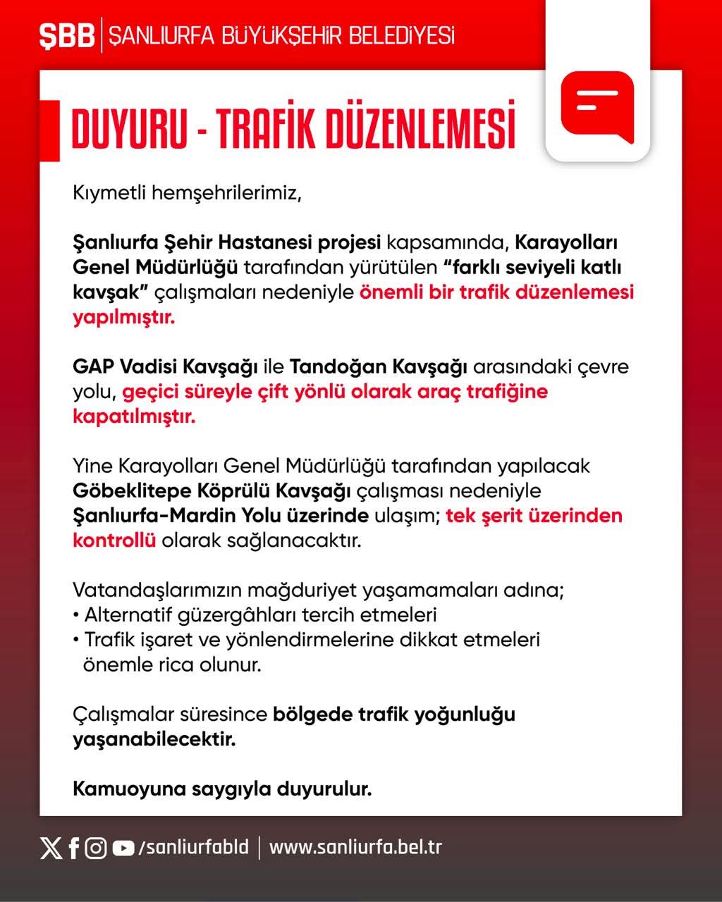 Şanlıurfa Büyükşehir Belediyesi, kentte devam eden büyük ölçekli ulaşım projeleri nedeniyle önemli trafik düzenlemeleri hayata geçirildiğini duyurdu. Vatandaşların mağdur olmaması için gerekli tedbirlerini almalarını istedi.
