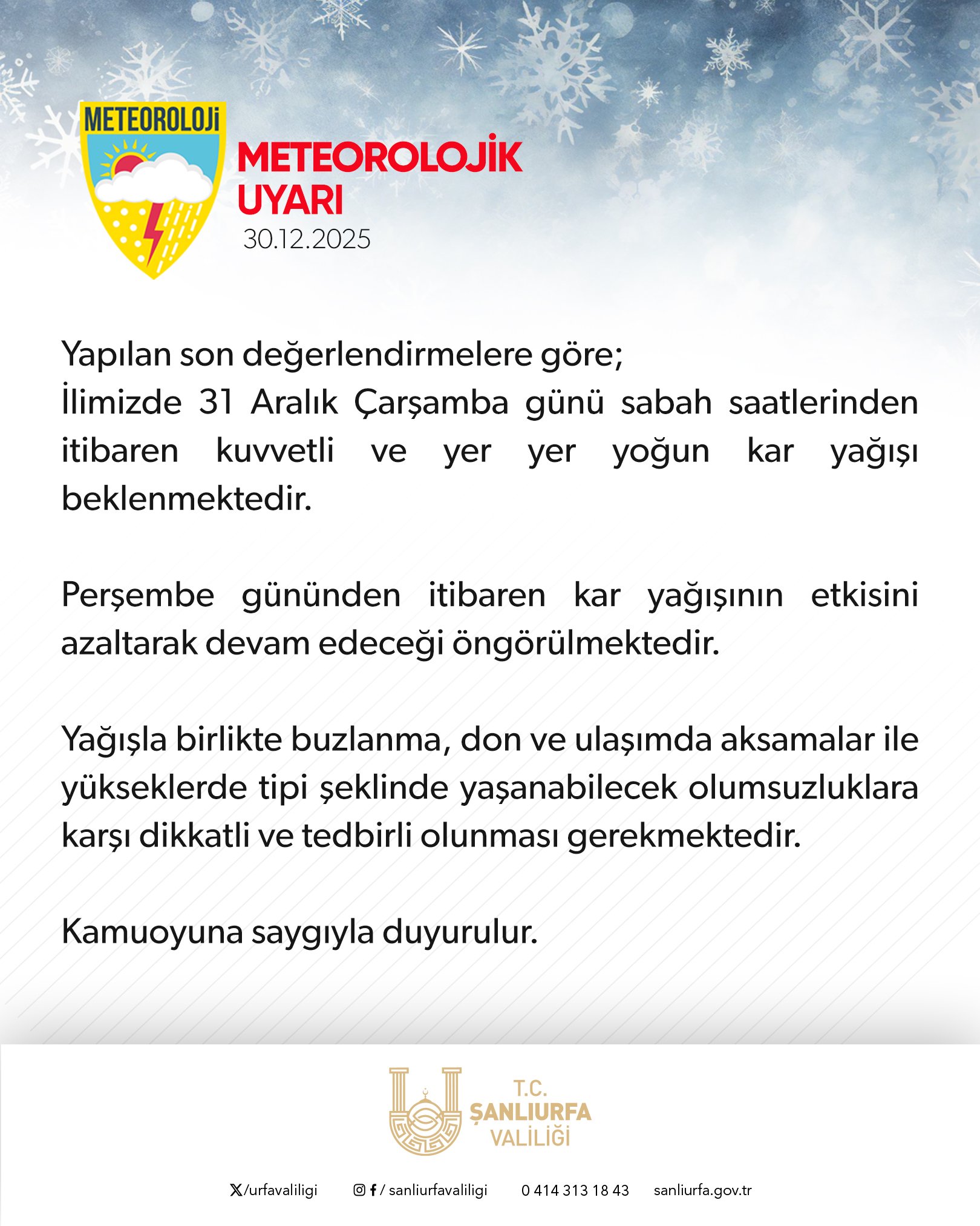 Şanlıurfa Valiliğinden yapılan açıklamada, şu ifadelere yer verildi:“Yapılan son değerlendirmelere göre; İlimizde 31 Aralık Çarşamba günü sabah saatlerinden itibaren kuvvetli ve yer yer yoğun kar yağışı beklenmektedir.