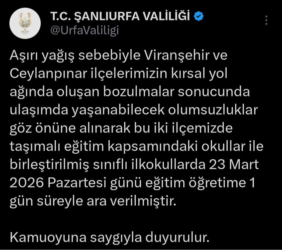 Urfa Valiliğinden yapılan açıklamada, şu ifadelere yer verildi:“Aşırı yağış sebebiyle Viranşehir ve Ceylanpınar ilçelerimizin kırsal yol ağında oluşan bozulmalar sonucunda ulaşımda yaşanabilecek olumsuzluklar göz önüne alınarak bu iki ilçemizde taşımalı eğitim kapsamındaki okullar ile birleştirilmiş sınıflı ilkokullarda 23 Mart 2026 Pazartesi günü eğitim öğretime 1 gün süreyle ara verilmiştir.”