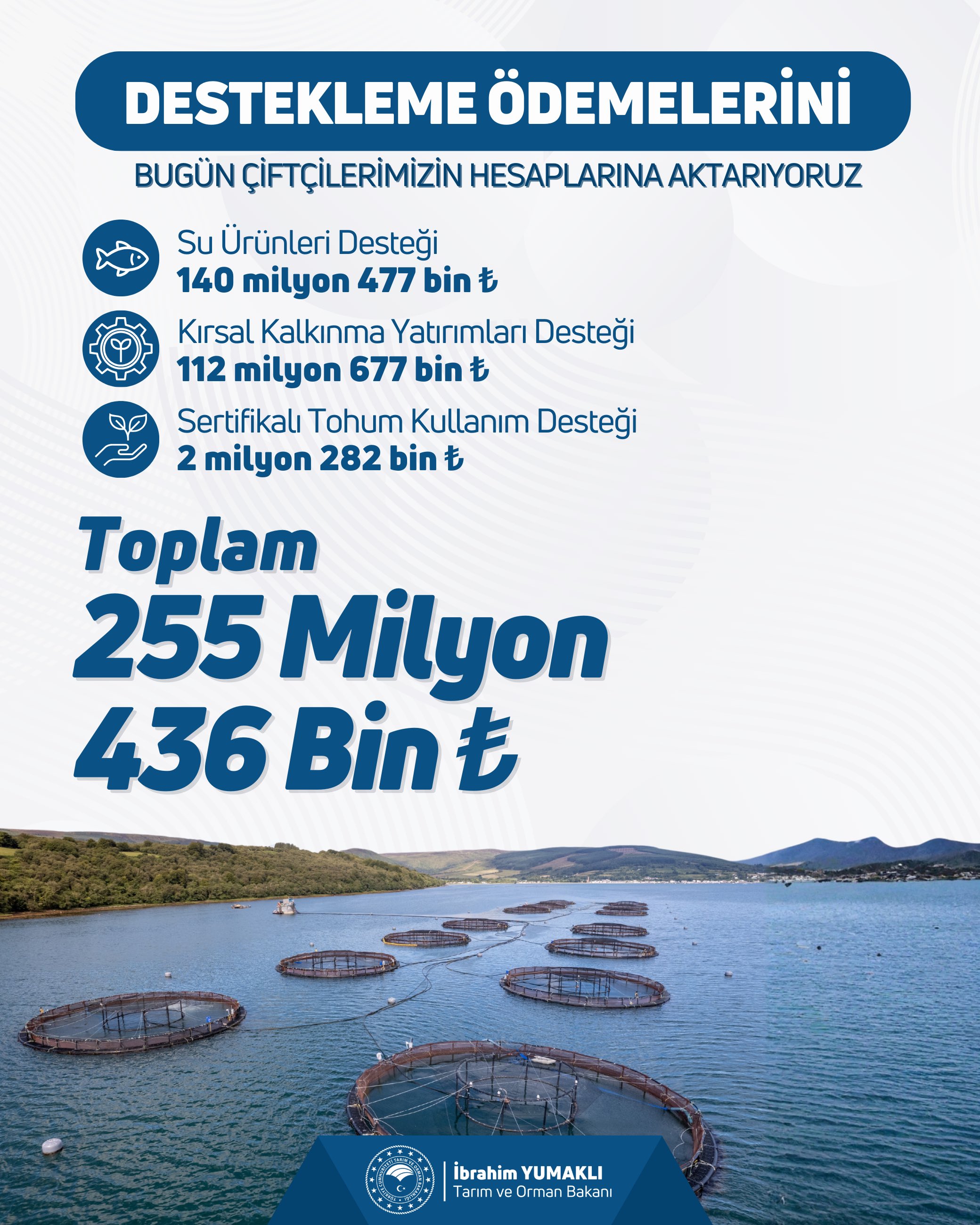Öte yandan bakanlık tarafından yapılan paylaşımda, su ürünleri desteği için 140 milyon 477 bin lira, kırsal kalkınma yatırımları için 112 milyon 677 bin lira, sertifikalı tohum kullanımı için 2 milyon 282 bin lira destekleme ödemesi yapılacağı açıklandı.
