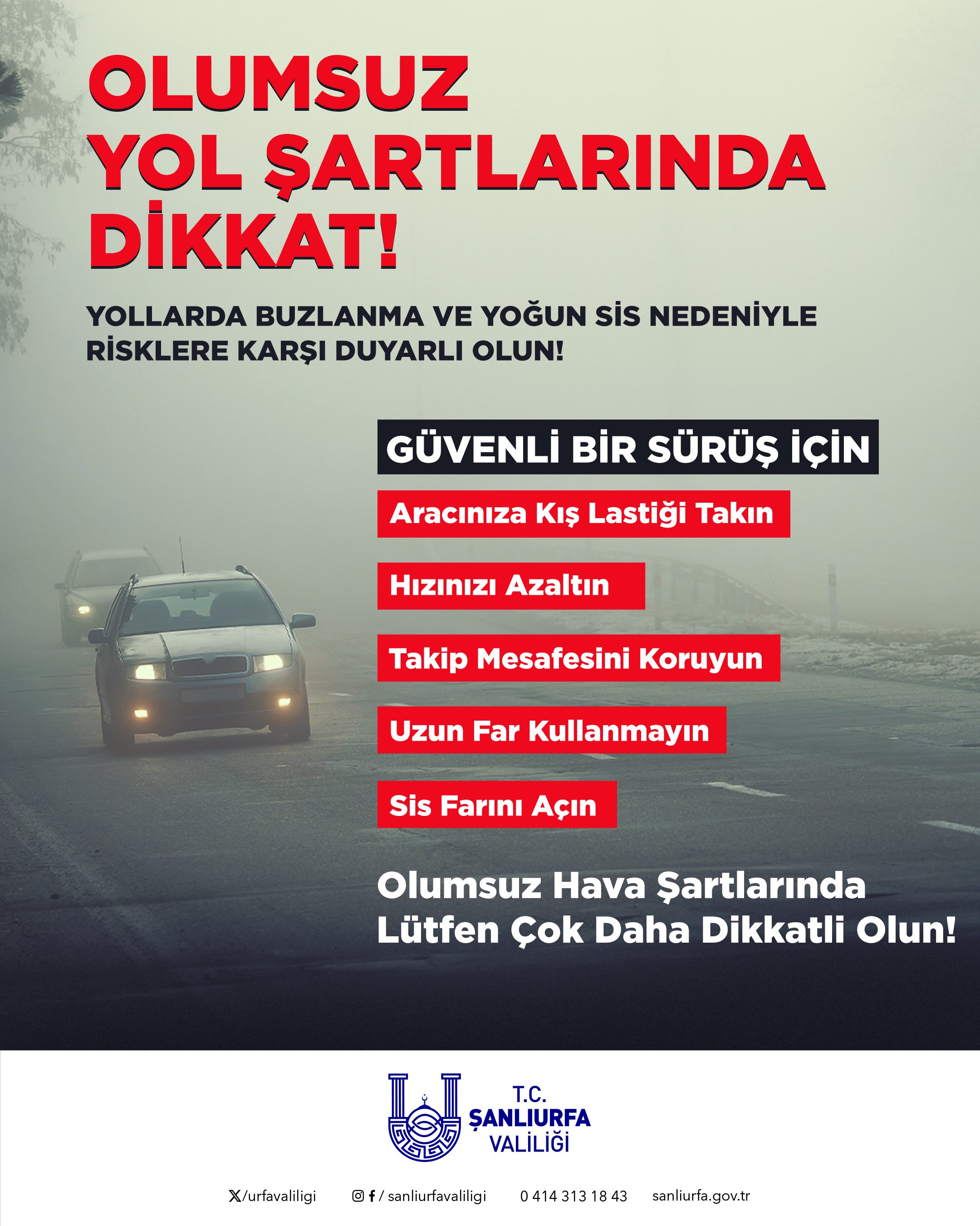 Şanlıurfa Valisi Hasan Şıldak, olumsuz hava koşulları nedeniyle sürücüleri uyardı. Vali Şıldak, yollardaki buzlanma ve yoğun sise karşı vatandaşların dikkatli olmalarını istedi.