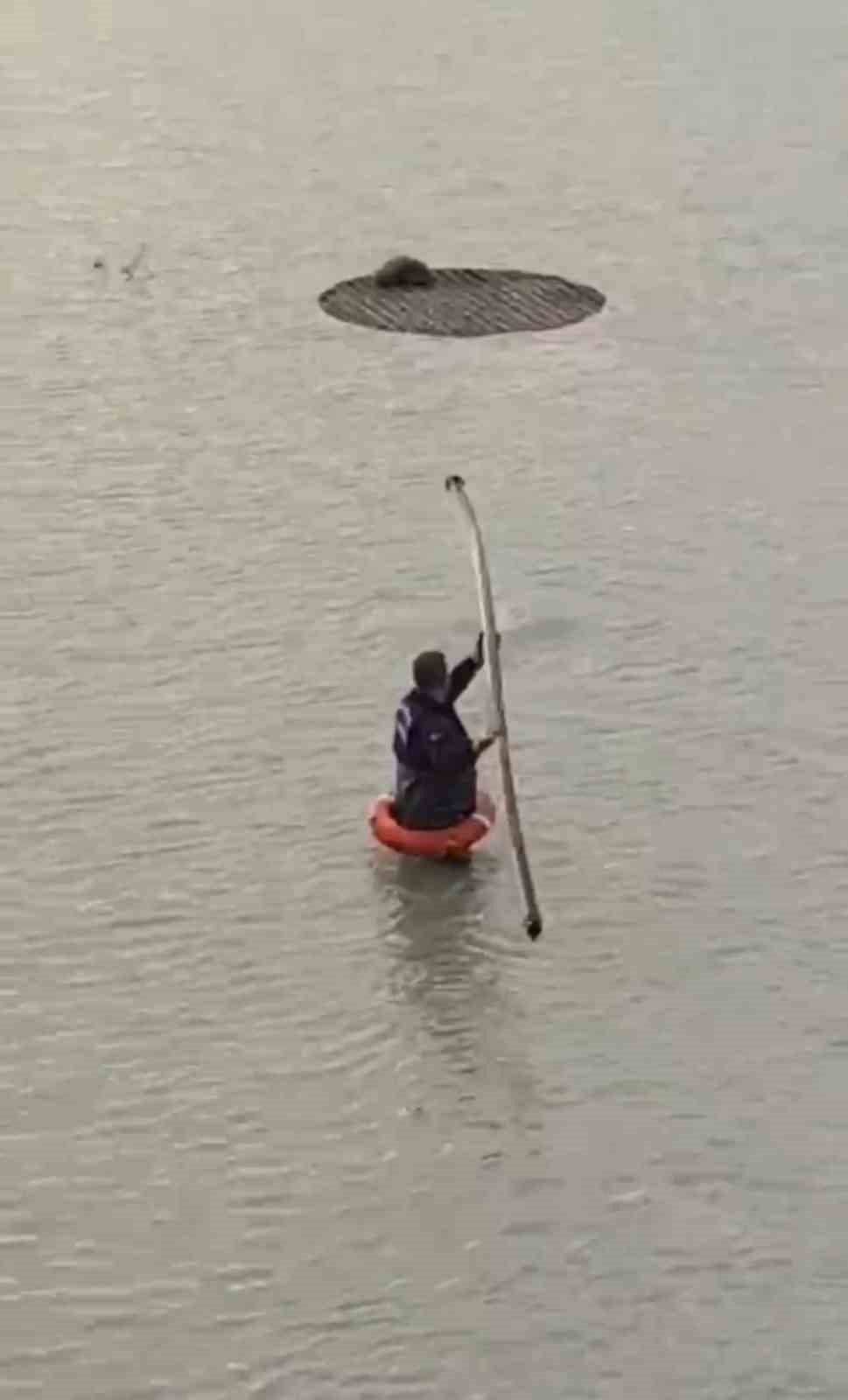 İtfaiye personeli tilkinin tırmanması için sopayla suya vurarak ilerlemesini sağladı.